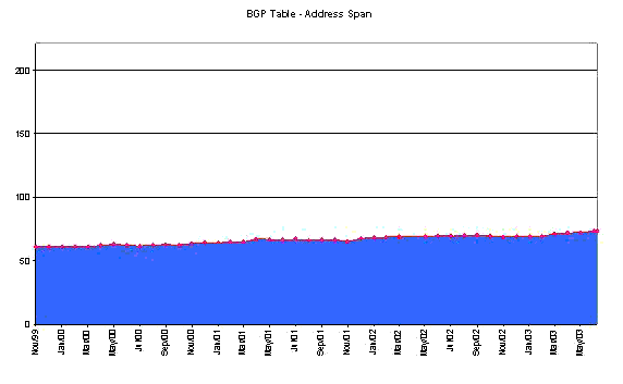 Once addresses are assigned to end networks, the expectation is that these addresses will be announced to the network in the form of routing advertisements. So some proportion of these addresses are announced in the Internet's routing table. How large is the address space covered by the routing table?