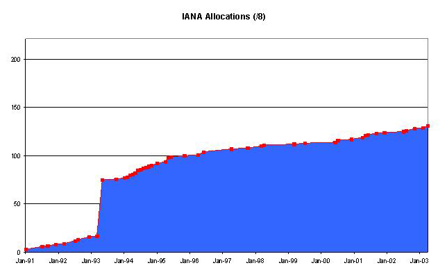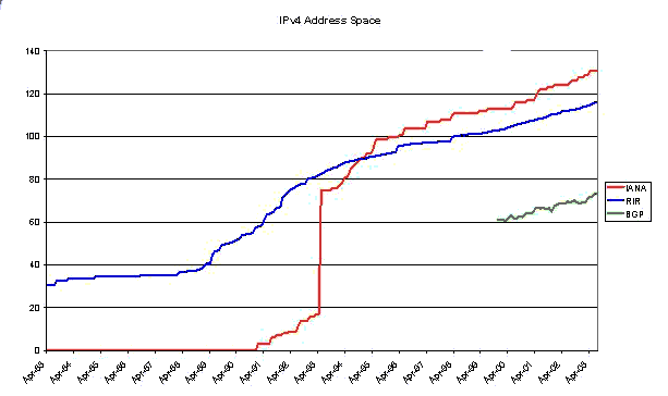 In this article I'd like to revisit a particular piece of analysis that has been a topic of considerable interest at various times over the past decade or more. The basic question is "how long can the IPv4 address pool last in the face of a continually growing network?" We've seen in the industry press at regular intervals dire reports that the IPv4 sky is falling and somewhere on the globe they've "'run out" of addresses. Once again its probably time to take a more considered look at the problem and see what numbers come out from this exercise using data collected up to 2003.