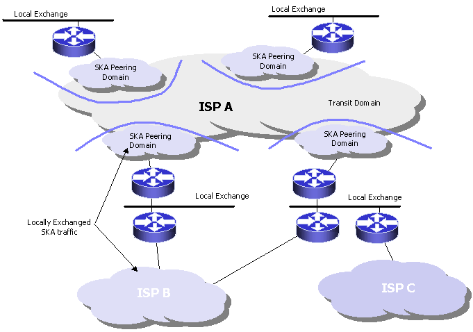 A typical feature of the SKA peering environment is to define an SKA peering in terms of traffic peering at the client level only. This definition forces each peering ISP to be self-sufficient in the provision of transit services and ISP infrastructure services that would not be provided across a peering point. This process may not result in the most efficient or effective Internet infrastructure, but it does create a level of approximate parity and reduces the risks of leverage within the interconnection. In this model, each ISP presents at each interconnection or exchange only those routes associated with the ISP's customers and accepts only traffic from peering ISPs at the interconnection or exchange directed to such customers. The ISP does not accept transit traffic destined to other remote exchange locations, nor to upstream ISPs, nor traffic directed to the ISP's infrastructure services. Equally, the ISP does not accept traffic that is destined to peering ISPs, from upstream transit providers. The business model here is that clients of an ISP are contracting the ISP to present their routes to all other customers of the ISP, to the upstream providers of the ISP, and to all exchange points where the ISP has a presence. The particular tariff model chosen by the ISP in servicing the customers is not material to this interconnection model. Traffic passed to a peer ISP at the exchange becomes the responsibility of the peer ISP to pass to its customers at its cost.
