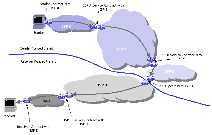 In a simple model of the operation of the Internet, each ISP owns and operates some local network infrastructure, and may choose to purchase services from one or more upstream service providers. The service domain offered to the clients of this network specifically encompasses an Internet subdomain limited to the periphery of the ISP network together with the periphery of the contracted upstream provider's service domain. This is a recursive domain definition, in that the upstream provider in turn may have purchased services from an upstream provider at the next tier, and so on. After the client's traffic leaves this service domain, the ISP ceases to directly, or indirectly, fund the carriage of the client's traffic, and the funding burden passes over to a funding chain linked to the receiver's retail service. For example, when traffic is passed from an ISP client to a client of another provider, the ISP funds the traffic as it transits through the ISP and indirectly funds the cost of carriage through any upstream provider's network. When the traffic leaves the provider's network, to be passed to either a different client, another ISP, or to a peer provider, the sender's ISP ceases to fund the further carriage of the traffic. In other words, these scenarios illustrate the common theme that the retail base of the Internet is not an end-to-end tariff base. The sender of the traffic does not fund the first hop ISP for the total costs of carriage through the Internet to the traffic's destination, nor does the ultimate receiver pay the last hop ISP for these costs. The ISP retail pricing structure reflects an implicit division of cost between the two parties, and there is no consequent structural requirement for interprovider financial balancing between the originating ISP and the terminating ISP.