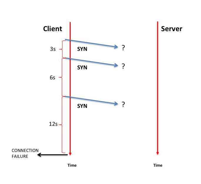 Unix-based TCP implementations are similar to Windows TCP, but tend to be more persistent in terms of waiting for a response to the SYN packet. MAC OSx 10.7.2 (whose TCP stack and configuration settings closely resemble that of FreeBSD) uses 10 retransmits spaced at intervals of 1, 1, 1, 1, 2, 4, 8, 16, and 32 seconds, and a generic TCP connection attempt will wait for a total of 75 seconds before returning a connection failure indication to the upper level application. The Linux operating system uses a slightly different retransmit settings. A setting I've encountered frequently is one with 5 SYN retransmits with successive wait intervals of 3, 6, 9, 12, 24 and 48 seconds. Linux will wait a further 96 seconds before reporting connection failure. That's an impressive 189 seconds, or slightly over 3 minutes between the application opening the session and triggering TCP to send the first SYN packet and receiving a connection failure indication from the TCP protocol engine.
