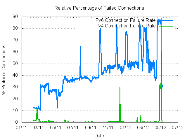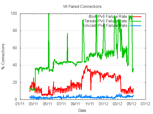 This is an amazingly high number, but it has a simple explanation. In an effort to increase the penetration of IPv6 the Microsoft Windows platform has for many years been shipping systems that include a combination of dual stack functionality and auto-tunnelling of IPv6 over IPv4. This IPv6 auto-tunnelling functionality had to be manually be turned on in Windows XP, but was on by default for the more recent Windows 7 and Windows Vista platforms. If the Windows unit was located behind a NAT it used Teredo as the auto tunnelling mechanism and if not then it used 6to4. And, like all forms of auto-tunnelling, the experience has been less than impressive. Teredo has a failure rate where 40% - 45% off all connection attempts simply fail to complete. 6to4 is only a little better, where we are able to measure a failure rate of between 10% to 25%. This behaviour has been in shipped products for many years, but it was only identified as a significant cause of user frustration quite recently. Why? Because so few services were configured as dual stack. So this was a problem just waiting to be exposed, and of course the increased levels of urgency over IPv6 transition due to the exhaustion of IPv4 addresses was the trigger.