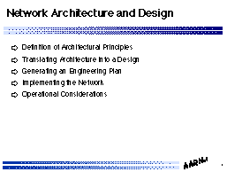 The topic covered is the architecture issues concerned with the development of national network infrastructures, focusing specifically on the issues involved with developing countries, the issues involved with the establishment of such infrastructure activity. The presentation looks at this from a perspective of the architecture of such systems.