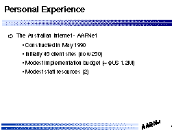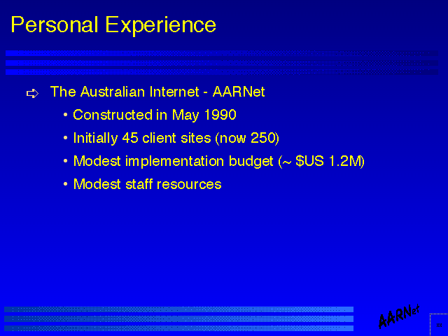 To provide some insight as to the perspective of the author within the scope of this presentation, the author's background is that of the architect, engineering manager and overall project manager of the implementation of the Australian Academic and Research Network in Australia, the major Internet Service Provider within Australia (the entire operation was staffed with a single employee (the author) for the first year, so there was little choice but to assume all potential roles for the period!)