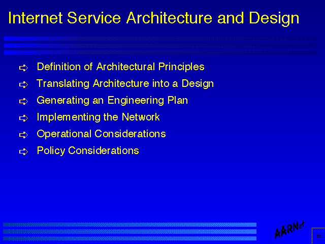It is noted that this presentation is not intended to be a specific "cookbook" for the design and implementation of a national Internet network service - this presentation will cover various aspects of this task in very general terms. In this task there is no universal "right" or "wrong" way to undertake such activity. The following are very much views derived from the personal experience of constructing a national network infrastructure within Australia over the period from 1989 until 1994, and the associated experience of working with the Internet environment globally over this same period. It is readily acknowledged that whatever attempts at "guidelines" that are proposed within this presentation will, necessarily, be extensively modified within the practical environment of a particular nation or region, and accordingly the author cautions any reader to view the following more as a set of personal observations rather than a more substantive set of objective and rigid principles.